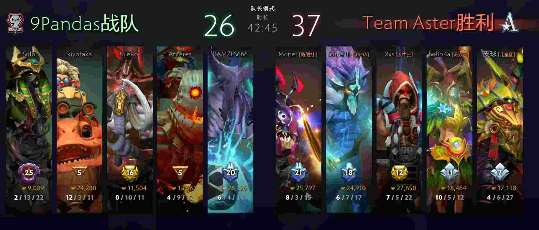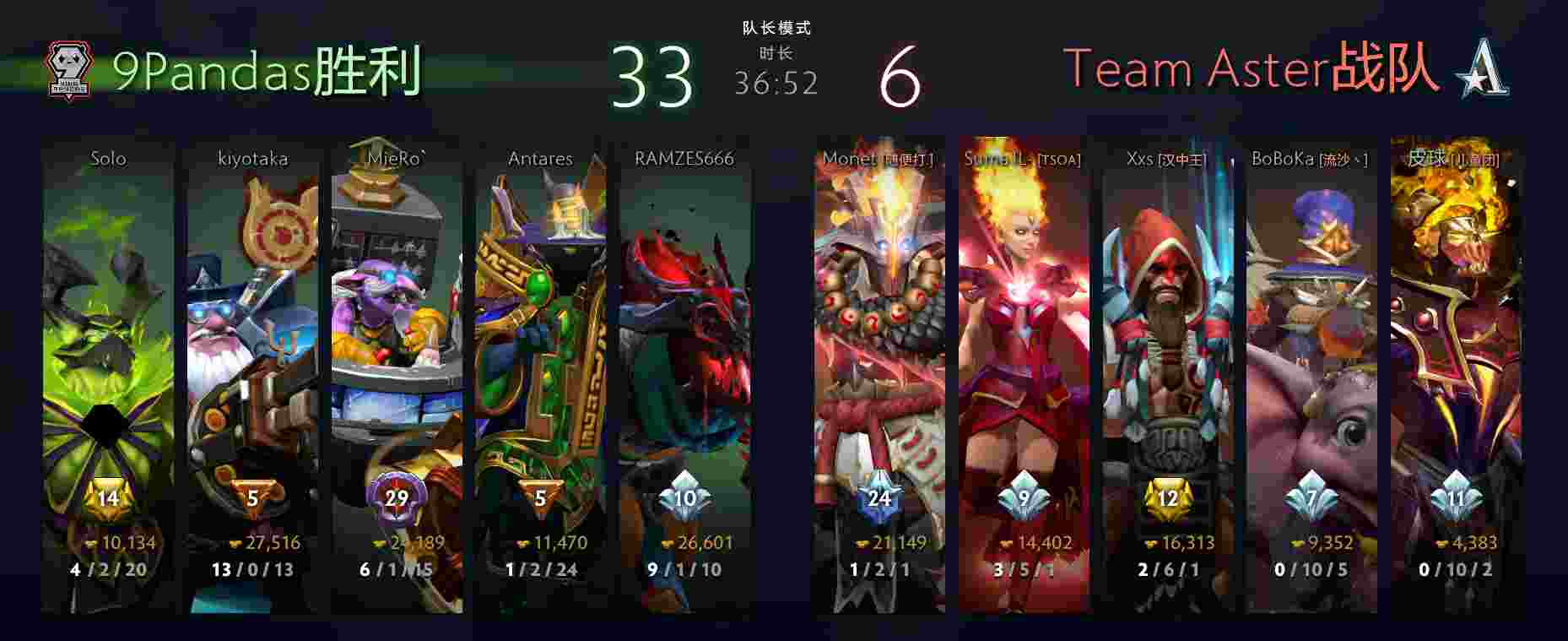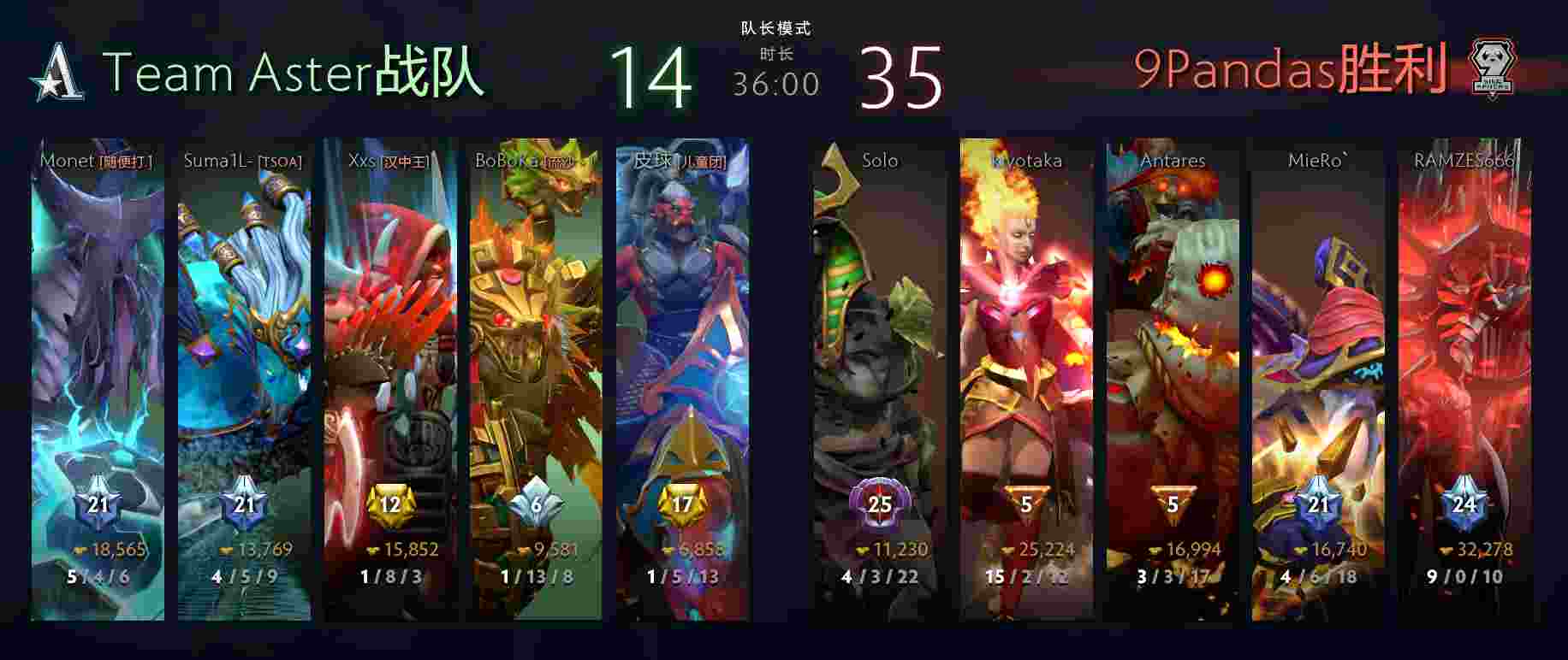 Aster需要在9pandas阵容没有成型之前终结比赛,而Aster也是按照阵容的需要执行计划,在线上打出了一些小优势,但在中路的处理上出现了不少问题,Sumail接连被Gank前期的优势荡然无存,Aster只能转为对刷,好在整体的经济依旧保持的不错,特别是Boboka的小鹿,经济甚至一路上都领先对方的三号位猛犸,而本场比赛的关键有两点,一个是下路野区的那一波团,Ramzs666的虚空在能大招控住Aster三大哥的时候没有选择放大不小心按倒了疯脸,在疯脸结束之后又只大到了一个五号位剧毒,使得整波团战溃败,让Aster重新手握不小的优势。还有一点就是Aster对于Roshan的控制,Aster总是在Roshan刷新前的2分钟左右与9pandas开启团战,9pands虽然每次都能用自己的大招团战阵容占到一些小便宜,但在Roshan刷新之后却就毫无接团的能力,Aster都是以0代价拿下Roshan,这两点可以说是本场比赛获胜的关键。