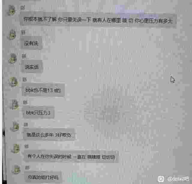 贴吧有网友爆料称:BOBOKA常年压力三号位,人称啧人神。只要XXS稍有失误BOBOKA就会语言压力XXS,让XXS十分痛苦。BOBOKA已经压力XXS三年了,这样导致XXS状态下滑严重。BOBOKA还在背后议论XXS是富二代,在打Ti期间各种低情商发言。