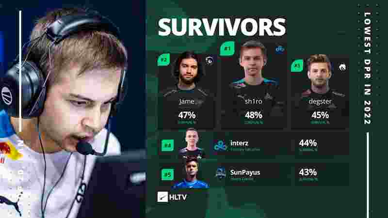 根据统计,排名第一的Sh1ro以48%的生存率独占鳌头,而以Jame Time著称的Jame则以一个百分点之差屈居第二,排名第三的则是刚刚转会OG的degster,第四名是唯一一名上榜的非狙击手interz,第五则是MRS的当家狙击手SunPayus。