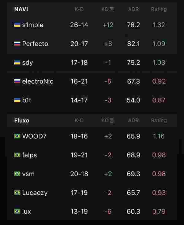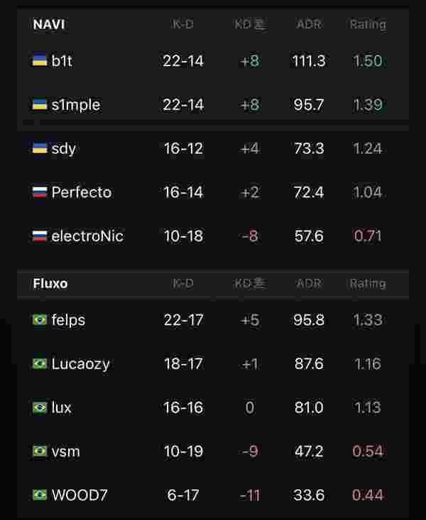 BLAST Premier 2022秋季决赛,刚刚折戟Major的天生赢家NAVI遭遇了巴西战队Fluxo,后者在BLAST Premier 2022秋季复活赛 北美区连战连胜成功晋级正赛。面对NAVI,Fluxo全员的表现可圈可点,felps的个人能力和Fluxo严密的战术给NAVI带去了巨大的压力,反观NAVI虽然赢下比赛但是战术细节上的缺失却让人担忧。经过两场大战,NAVI击败Fluxo挺进胜者组的下一阶段。