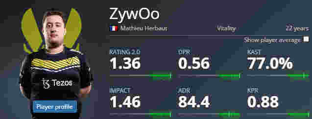 Mathieu Herbaut | ZywOo强大的个人能力,正是在他超人般发挥的前提下,Vitality才得以顺利杀入八强进而来到决赛。然而,随着一支黑马战队不断刷新观感,在结束半决赛阶段的比赛之后,我们发现,ZywOo的个人数据竟然在全部选手中被甩到第二。