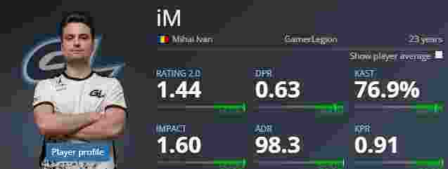 Mihai Ivan | iM,半决赛对阵Heroic,iM一人砍下73个Frag,Rating高达1.40,而在前一场1/4决赛中,疯狂的iM更是在BO3对局中打出了1.78的夸张Rating。