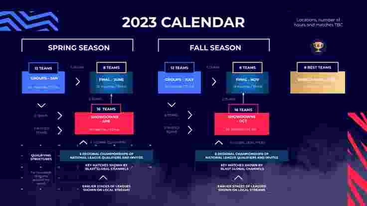 BLAST巡回赛事体系将分为春秋两季,每一季由一次线下小组赛、一次线上showdown以及线下场馆举办的季节总决赛构成。小组赛全程采用BO3,12支队伍中成绩最好的6支队伍将直通季节总决赛,欠佳者则要在showdown与预选赛晋级者争夺剩余名额。
