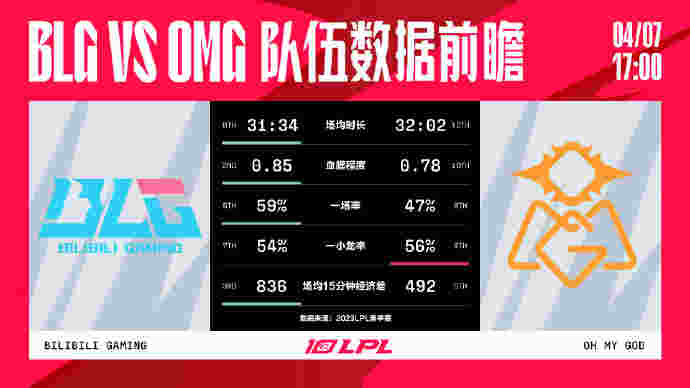 两支队伍的风格不太相同,BLG很喜欢在前期通过选手的个人能力在野区或者线上撕开一个口子,然后迅速滚雪球扩大优势;OMG更喜欢选一些团战阵容,发育到中后期通过团队阵容优势打出一波精彩5V5场面。综上所述,BLG的场均时长以及血腥程度都要比OMG更高,一塔率BLG远超对手为59%,一小龙率则是OMG稍强一些为56%,场均15分钟经济差双方相差不多,BLG更高些为836排名联赛第三。
