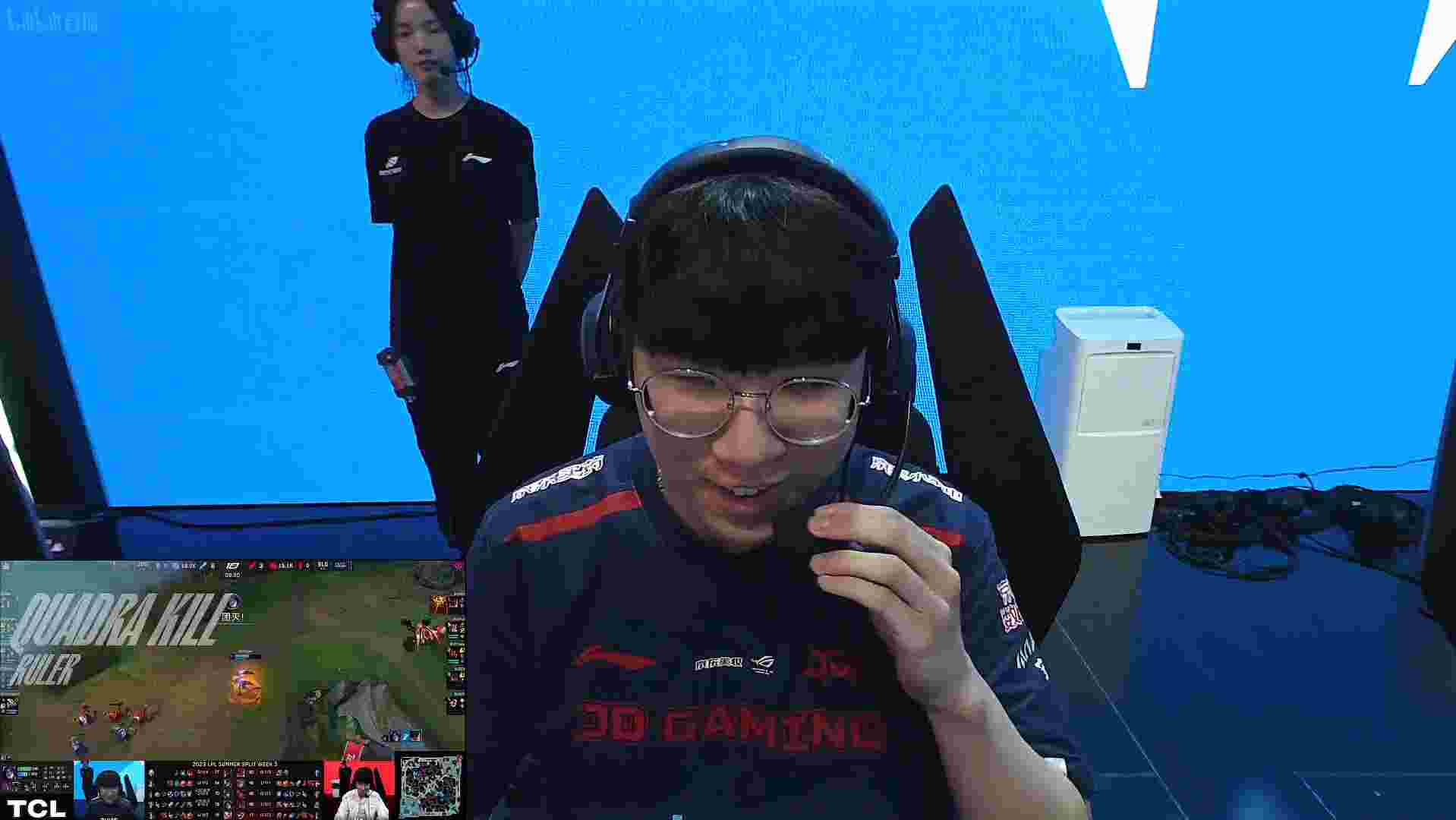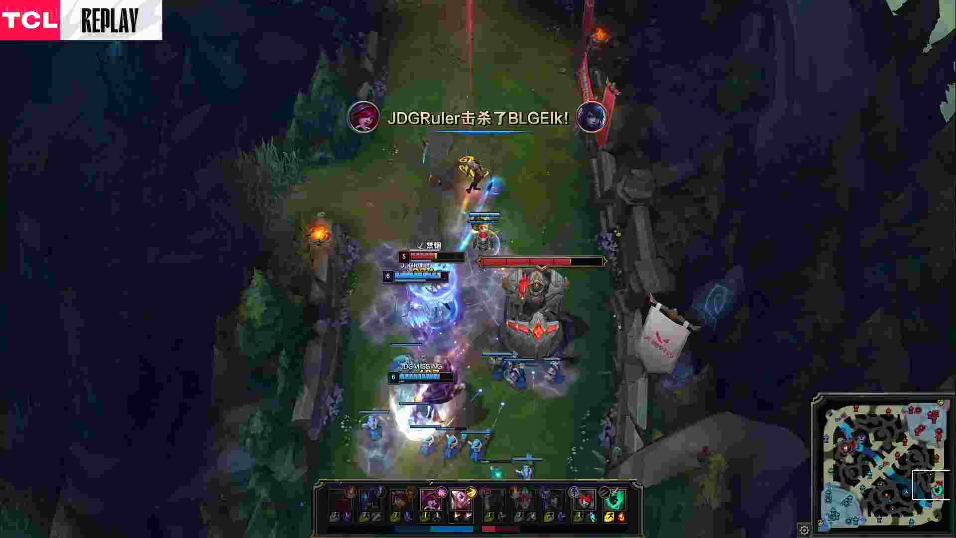 来到第一条先锋团,两队上中野3v3,JDG打野换掉BLG中野两人,与此同时JDG下路2v2越塔将BLG下路两人击杀。在BLG下路复活过后JDG中路又来到下路将锤石击杀。BLG下路被打穿了。