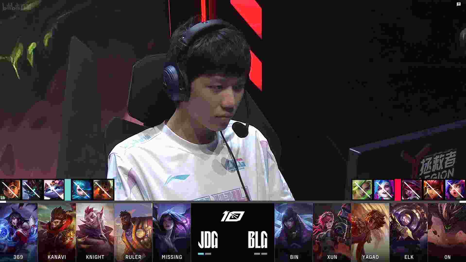 比赛开局5分钟,JDG下路组越塔击杀了BLG厄斐琉斯。随后与上一局一样,JDG下路线杀过后,中野又来到下路将BLG下路两人击杀。