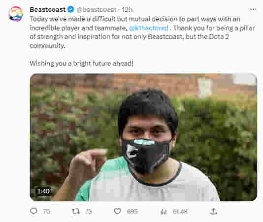 今日,我们团队做了一个非常艰难的决定,我们决定和K1这位传奇队友分别,感谢他为bc战队以及整个Dota2游戏社区所贡献的力量。祝愿未来一切顺利!