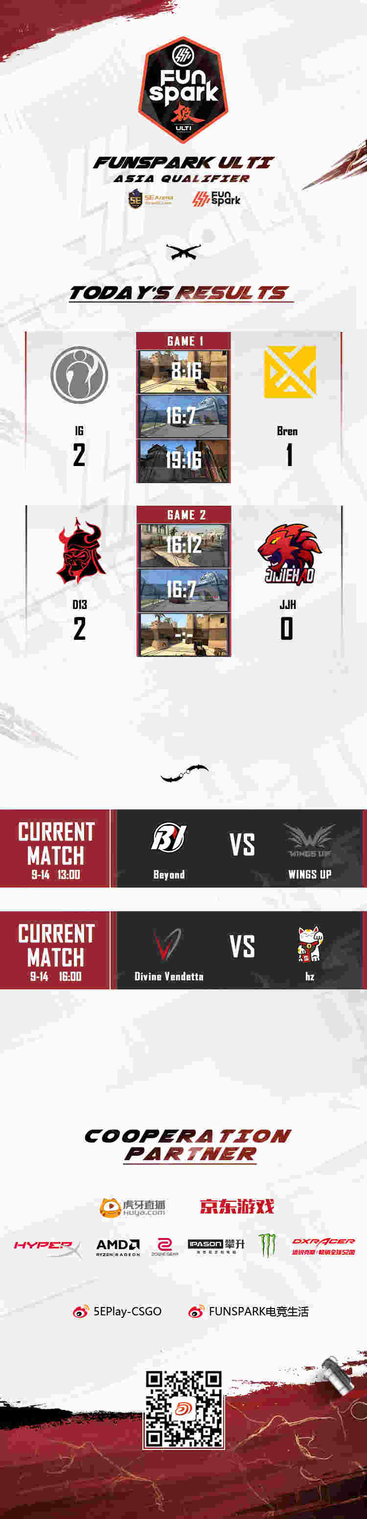 在今日Funspark ULTI亚洲区第二日的比赛中,IG对决Bren两队前两张地图凭借队内大腿的发挥各自赢下对手选图,在图三全场焦灼的两队最终还是IG在加时赛中率先打破僵局以19-16险胜拿下开门红。另外一场比赛D13面对到国内新军JIJIEHAO时还是经验致胜,出色的残局处理帮助D13以2-0的总比分成功取胜。