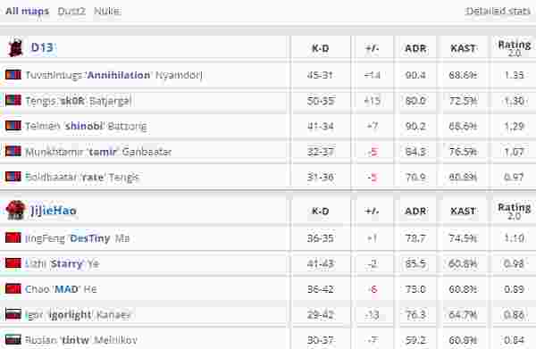 年轻新军JIJIEHAO在FunSpark ULTI的首场比赛中面对到D13还是显得欠缺些经验,敢打敢拼的JiJieHao在自己选择的Dust2的场面上丝毫不逊色与D13,但在关键的均势残局上经验丰富的蒙古战队配合上道具的投掷一次次将JiJieHao的阵地防守撕碎。8-14落后的JiJieHao在尾声阶段开始顽强追分,奈何D13今日手感奇佳,四位选手超过20杀的出色表现还是以16-12成功拿下首图。