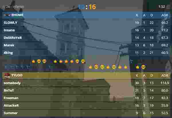 图二来到Infenro,执进攻方的Ehome选择B区封台上烟强攻,但躲在警家的俩人完美收掉3人过路费,依靠枪法收下手枪局的TYLOO再以2-0开局,随后TYLOO针对香蕉道巨大的压力,而TYLOO的精彩回防也让Ehome下包后无法成功守包,凭借出色的发挥TYLOO以5-0领先。但随后Ehome强大的韧性让一波流的战术无懈可击,快速的补枪根本不给TYLOO任何机会,Ehome逐渐将比分反超至7-6。而后Ehome屡屡在香蕉道偷人得手,人数优势的Ehome直接以9-6结束上半场。