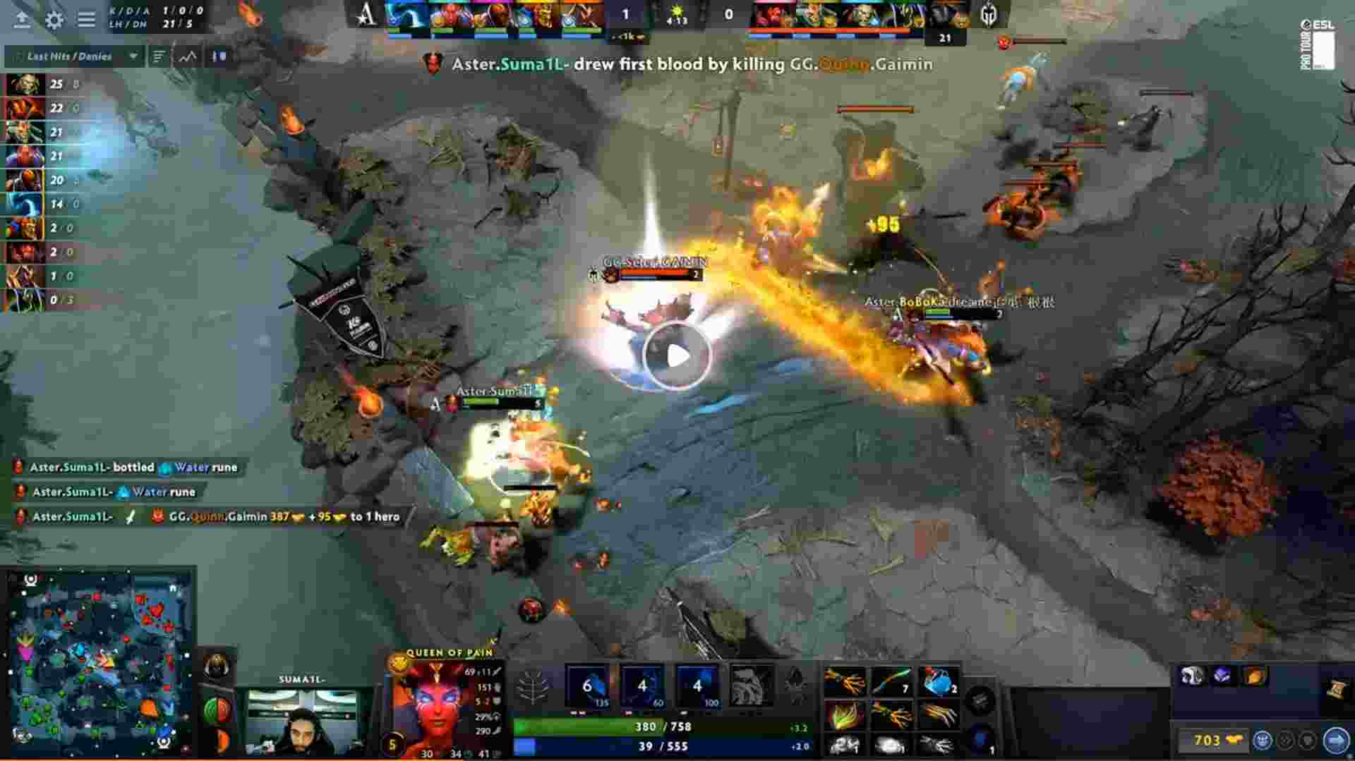 4分钟,Aster双酱油包中控符,火猫被杀,女王拿到一血。送塔的蝙蝠来到下路又击杀了狼人。