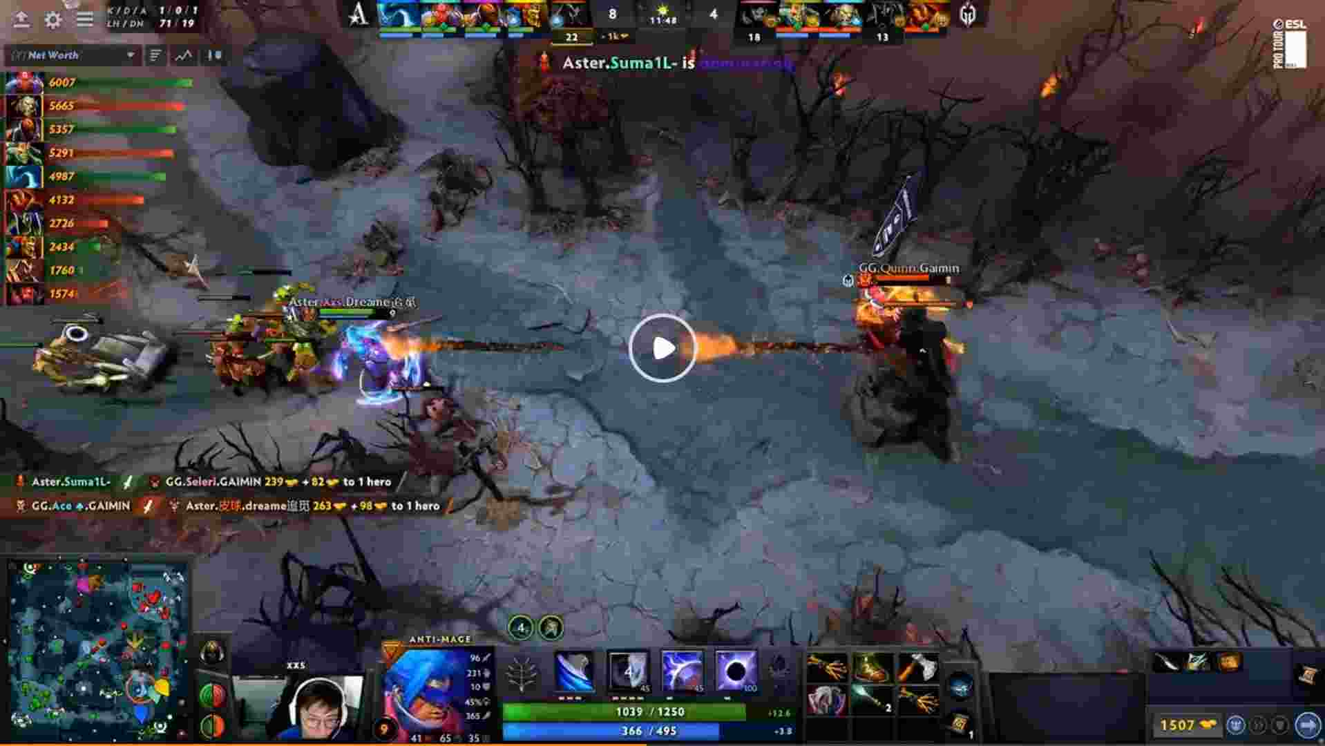 Aster在天辉,GG在夜魇。对线方面,中路Sumail女王对Quinn的火猫;下路Monet水人和皮球沉默对Ace的狼人和tOfu的拉比克;上路Xxs的敌法师和BoBoka的蝙蝠对dyrachyo的美杜莎和Seleri的毒狗。