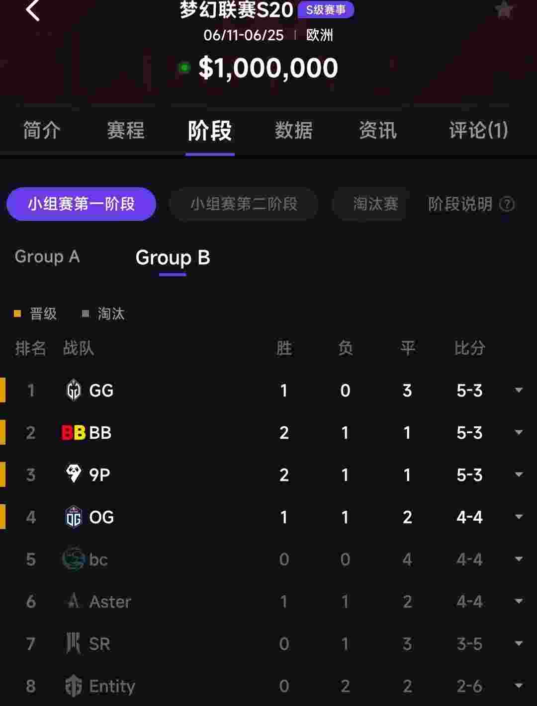 梦幻联赛S20小组赛第一阶段第二日比赛,Aster 1-1 GG握手言和。目前GG 1胜3平0负积5分和BB、9 Pandas并列第一,Aster则以1胜2平1负共4分的成绩和bc并列第4。最难的对手都已经接过招,剩下SR、BC、Entity三个小组目前暂时靠后的对手需要他们争取更多分数。B组相较A组也是激烈异常,排名第一的GG还不能确定提前出线、排名最后的Entity都还有理论上晋级的可能。希望Aster后面的比赛认真对待,每一场都是晋级第二阶段的关键!