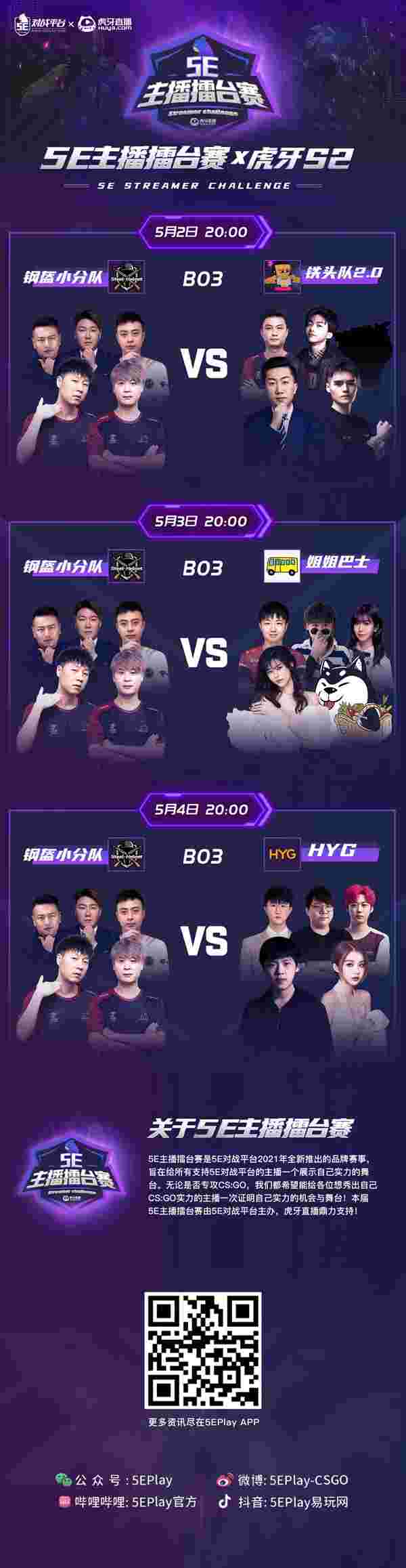 5月2日至4日,5E主播擂台赛X虎牙S2将在每晚20:00为大家准时带来精彩的CSGO对决盛宴!本次擂台赛阵容同样群星璀璨,CSGO区大神还有其他分区的众多人气主播助阵。沫子、Sccc、AJ、卡莎、茄子等人气主播悉数出动!CSGO区的知名主播同样倾巢出动参与本次赛事,星光熠熠,值得期待!