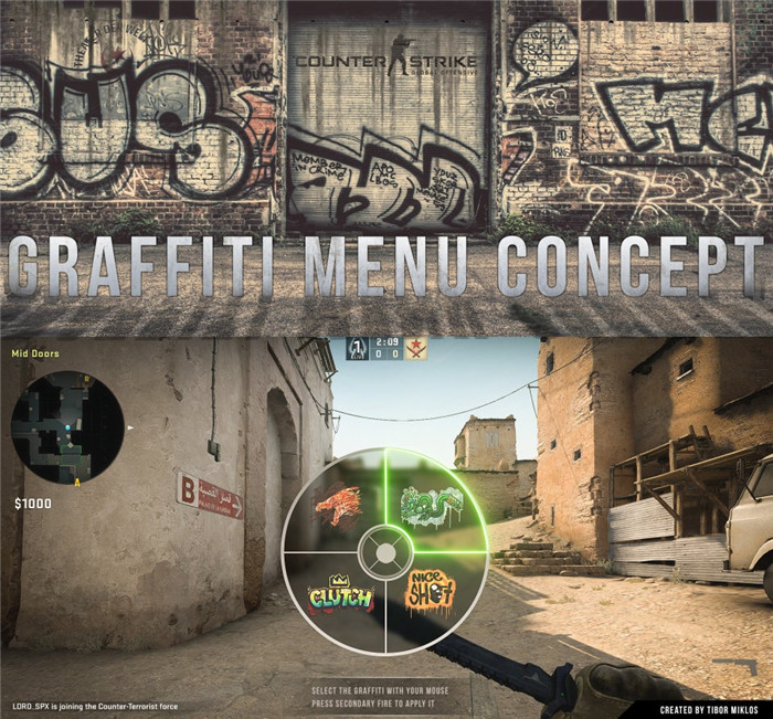 7.除对游戏本体的设计作品之外,也有玩家提出了游戏内优化ui界面的建议。针对喷漆排列位置不太够用的情况,国外网友设计了一款中间位置的选择菜单样式,感觉也挺不错的。
