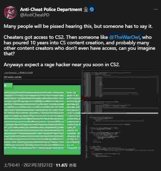 因为就在游戏发布的同一天,名为“反作弊警察局”(Anti-Cheat Police Department)的推特账户分享了一则让人无语的消息,那就是已经有作弊玩家得到了CS2测试版资格。