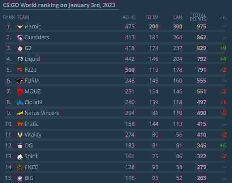 截止2023年1月3日,12月的HLTV世界排名如下:(图中的+/-对比的是11月排名)