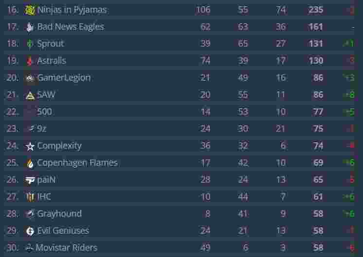 Natus Vincere和Vitality是前十名中跌幅最引人注目的队伍。独联体队伍跌至第九名,丹法以纵队则是受到EPL S16积分过期的影响,退至前十开外。G2获得了最大涨幅,成功跻身前三。