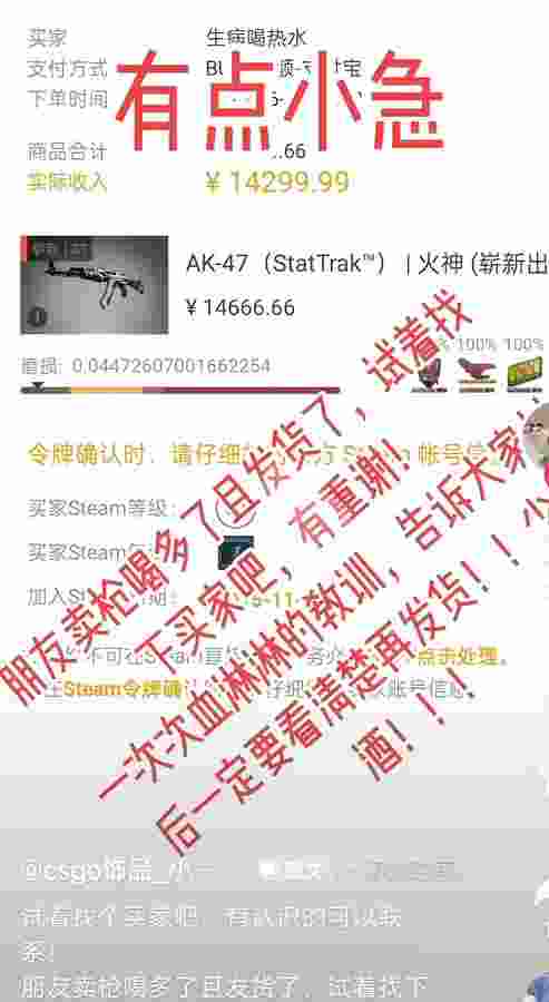 11号的时候有CSer发现一位卖家在出售自己的四卡托崭新暗金火神时,少打了一位数,把差不多20000美元价格的皮肤以2000美元的价格低价出售,实际交易额为14666.66元。判断是少数点看错了或者少打一个6。