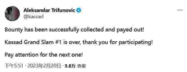 而最终TeamOne 战队成为了“幸运儿”,kassad也干脆利落的兑现了自己的承诺。在个人推特上,kassad表示已经完成了支付。第一届Kassad大满贯第一季正式结束!感谢各位的参与,敬请期待下一届Kassad大满贯!