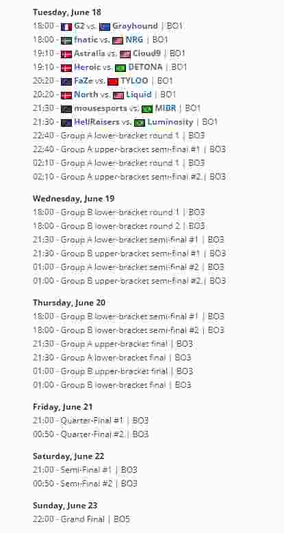 在首轮对阵中,瑞典战队fnatic将迎战最近状态起伏不定的NRG战队,Cloud9则会面对强敌Astralis,另一边中国战队TYLOO首轮将会对阵到FaZe,而最近被黑豹FURIA战队赶超排名的Mibr将同Mouz展开较量。