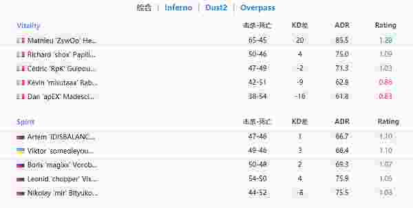 Vitality昨天的比赛可谓高开低走,图一是ZywOo的个人秀,1.87的rating笑傲全场,misutaa也轰下1.57的rating,两个年轻人的发挥帮助他们很快16-9拿下了比赛。可是进入到图二,Vitality的噩梦就开始了。misutaaa年轻人不稳定的一面展现出了,尴尬的0-18战绩险些破了纪录,先做防守方的他们拿下了手枪局但是很快被翻,一波10-0的小高潮直接给Vitality打哑火,数据方面仅有ZywOo依旧保持高水平发挥,shox偶有击杀但是难以影响局势,很快他们以5-16的比分输掉图二。