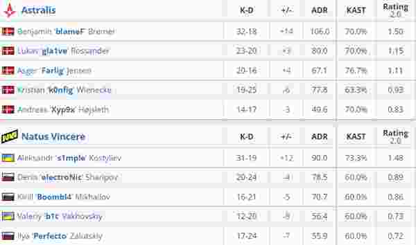 手枪局Astralis四人提A,NaVi手枪局完胜。长枪局NaVi反刷长廊取得人数优势,k0nfig从VIP突破摸到警家奠定胜局。次局Astralis速提长廊,Perfecto与electroNic双人四杀拦住攻势。第六局Astralis控下中路转B,farlig架绕后击杀electroNic解决隐患,比分4-2。玩起干拉的Astralis被s1mple大狙不断处决。k0nfig从A干摸到警家,electroNic中路反绕A厅略胜一筹。