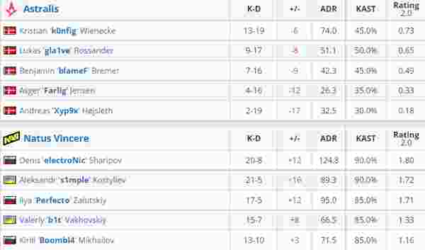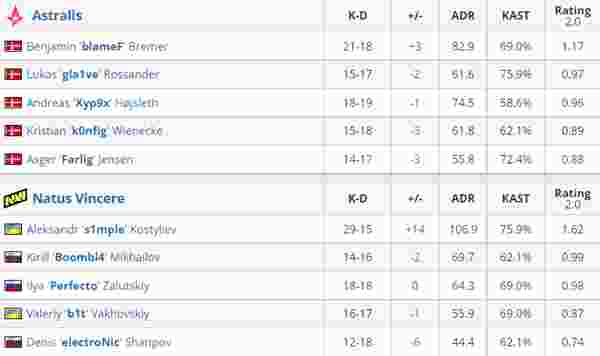 第十局k0nfig中路突破一换二,Astralis一波提B,比分7-3。NaVi意识到k0nfig的干摸开始前压中路防守,上半场比分12-3。下半场手枪局s1mple中路配合队友夹A,NaVi火力极强赢下手枪局。长枪局Astralis中路前压取得优势追回一分。次局farlig前压A厅被击杀,NaVi闪光提A拿到赛点。赛点局经济不好的Astralis失去图一。