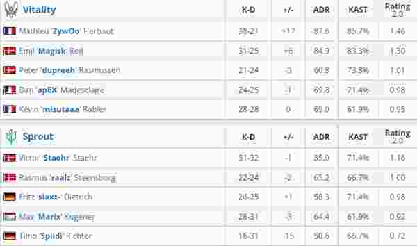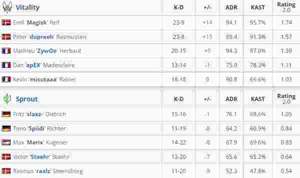 Vitality 2-0 Sprout(Dust2 16-7;Inferno 22-20)