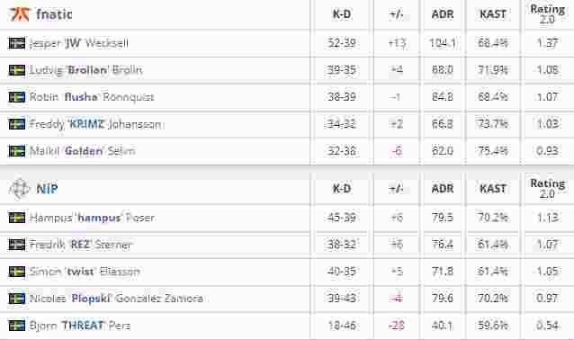 两只老牌强队的对抗图一是Nuke,两边分别在twist和Brollan的带领下交替得分,先丢掉手枪局的NiP半场落后三分,但是他们通过拿下下半场的手枪局成功扳回局势。然而在关键局机会的把握上还是fnatic更胜一筹,最终他们16-14拿下图一。来到Inferno,在这张更吃团队配合的地图上启用临时替补的NiP明显有点跟不上fnatic的节奏,防守方被对手多次攻破,转到进攻方也是节节败退。JW的狙击枪越打越疯,图二单场击杀31人带领fnatic最终16-11战胜NiP。