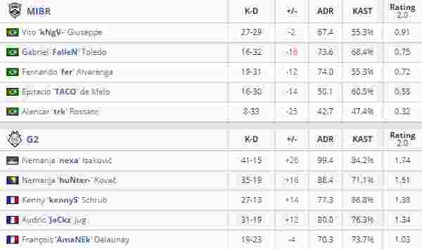 另一边G2对阵MIBR的比赛则是完全的一边倒,图一Vertigo,开局G2就通过快速提A拿到优势,MIBR仅仅通过上半场的个人能力发挥拿下两分,剩下的时间里都是G2队员的个人秀,huNter的残局,kennyS的大狙各自发挥,16-2带走对手。进入到Inferno,MIBR的防守显得畏首畏尾,拿不到信息也难以获得首杀,就这样11-4结束了上半场,huNter和nexa一个1.75的rating一个1.59的rating彻底掌控住了局势,16-4,G2轻松战胜对手。