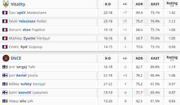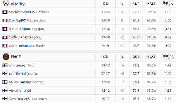 回到Inferno则是ENCE的主场,Aerial和sergej的A点火力猛,套路多;allu在B点也能打出多杀的操作,一时间Vitality失去了方向。misutaaa来了之后明显还没有适应Vitality在这张图上的打法,全场下来只拿到9个frag。带着优势进入下半场的ENCE虽然输掉了手枪局但是很快通过纯eco过度到长枪局拿下了这张地图。