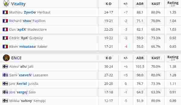 进入决胜图双方打得十分胶着,先是前三局的互翻就把双方的火气都提了上来,2-6之后Vitality连续通过小道打开局势慢慢将分数追了回来。进入下半场ENCE有着不错的开局,双方战至10-10,法国小将misutaaa站了出来帮助他们拿下了一个至关重要的残局,没有让经济崩盘。顽强的ENCE没有放弃他们继续追分,可惜成也allu败也allu,纵使他最后一张图砍下30个frag,但是最后一分也是因为他操之过急,没有等队友下包就抄后路被对手断住错失将比赛扳到加时的机会。