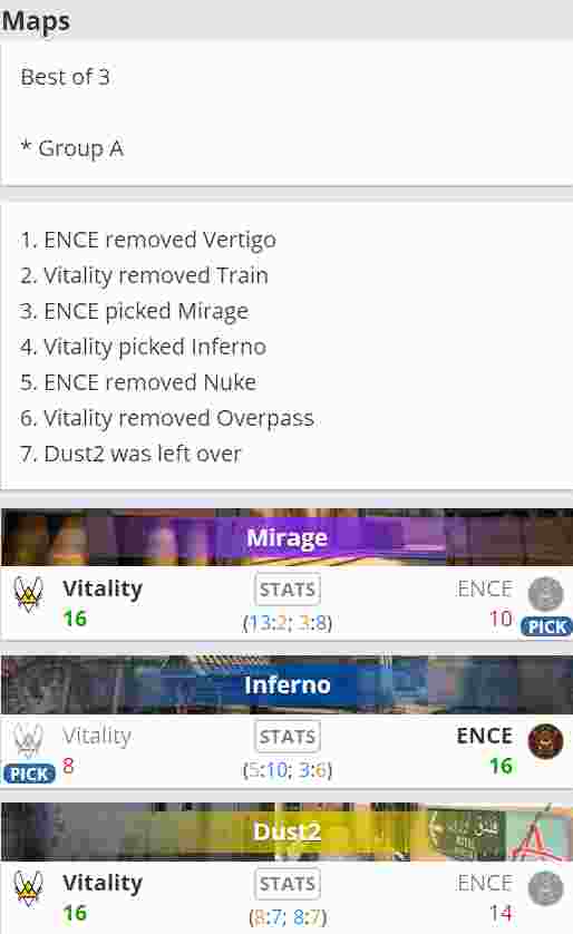 Vitality 2-1 ENCE(Mirage 16-10;Inferno 8-16;Dust2 16-14)