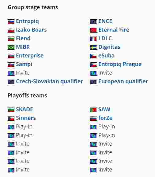 小组赛段的大部分名额已经确定,包括Entropiq、ENCE、MIBR以及Eternal Fire等。此外,还有两个名额分别来自欧洲区和捷克和斯洛伐克地区的预选赛。