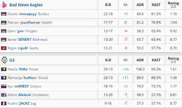 尽管G2没能拿下下半场的手枪局,但主鹰Niko在这一回合的手枪局中完成了三杀,为自己积累了手感,随后Niko的沙鹰完成了一个四杀,成功摧毁了Bad News Eagles的心理防线,在Niko和m0NESY的发挥下,G2拿到了赛点。