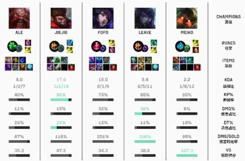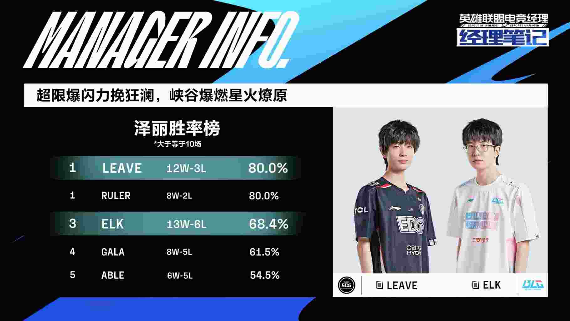 泽丽都是两边AD的拿手好戏,但是在今天的BO5中,泽丽这个角色仅在第三局中放了出来,由ELK使用并且赢下对局,其余四把泽丽都在BAN位(禁用)上。值得一提的是ELK在本轮BO5中怒砍30次击杀,战绩为30/11/36;与他对位的Leave战绩为15/20/34。