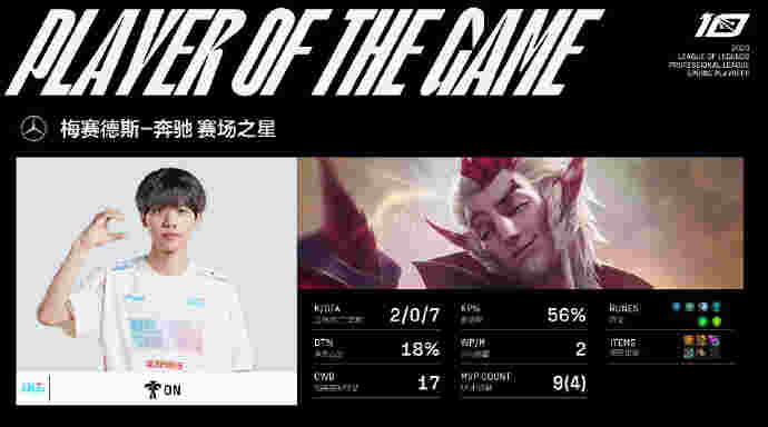在BO5的第三局比赛中,BLG辅助ON使用洛多次完美开团,是稳定的节奏发动机,并且战绩为2/0/7拿下本小局MVP,并且ON也成为了本赛季在辅助位上获得MVP次数最多的选手,MVP次数为9次。