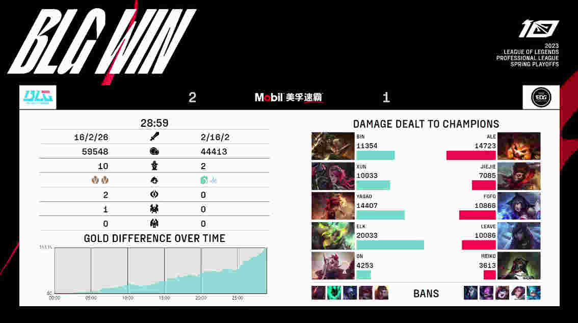 北京时间4月11日,2023LPL春季赛季后赛败者组决赛胜负已经揭晓,BLG鏖战五局3-2战胜劲敌闯入LPL春季赛决赛,而EDG止步季军无缘后续比赛以及MSI。在这场BO5中,产生了许多精彩的赛事数据,如下所示。