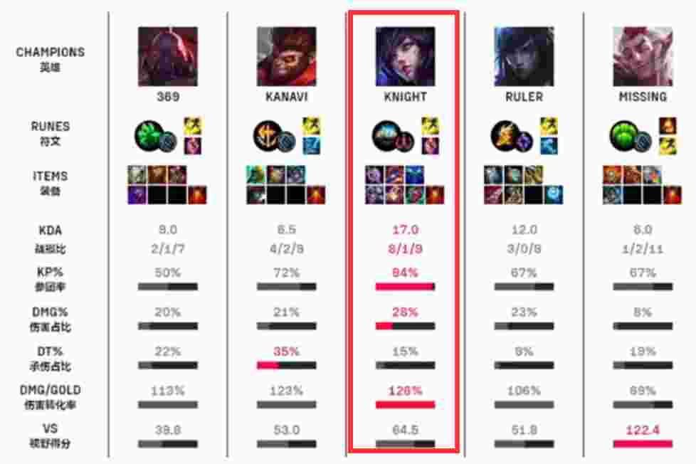 JDG中单knight在BO5的第一局游戏中选用狐狸,砍下8/1/9的豪华数据,KDA为17.0荣获本阶段KDA之王。