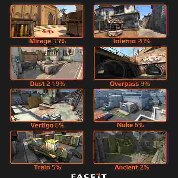 Mirage遥遥领先第二名的Inferno(20%)。随后是经典的Dust2,以19%排名第三。此外,Overpass的选取率为9%,Vertigo与Nuke均为6%。