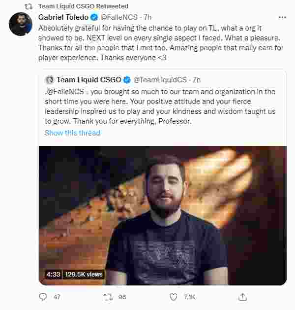 Liquid正式宣布,经过一年的效力,队内狙击手FalleN正式离队。在目前传言中,巴西教父或将领导一支新队伍出战,这支战队被普遍称为“最后一舞”,包括fnx、fer、boltz和VINI。
