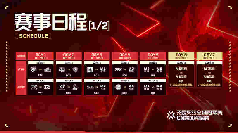 7月3日~4日的12进8首轮赛段,8支预选阶段晋级队伍将会面对残酷的单败淘汰;7月5日~7月6日的四分之一决赛赛段,此前四场比赛的胜者,将分别对阵ASE、BLG、FPX和EDG,胜者将会晋级半决赛,负者将跌入败者组面对更大的考验。