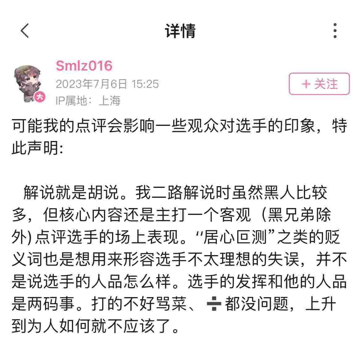 而SMLZ这一评价也引发了网友对FOFO的口诛笔伐,众人认为SMLZ平时是个话不多、不轻易评价其他选手的人,连他都用了居心叵测这个词,可见这波FOFO的思想或许真的出了问题。同时SMLZ也引发了营销号狂欢,到处都是截取他复盘的短视频,连带着FOFO也被骂得很厉害,微博遭到网友爆破。事情发酵以后,FOFO的韩服ID也改成了“woyouzui”(我有罪)