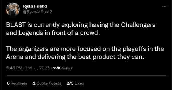 “BLAST目前正在探索让挑战者组和传奇组阶段都有现场观众的模式。”