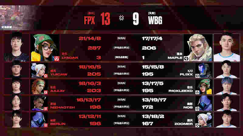 本张地图FPX 13:9 WBG,MVP给到了Lysoar选手。