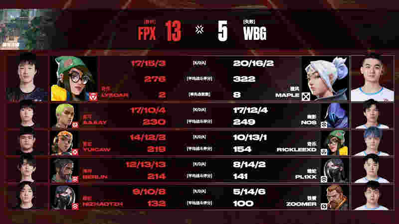 全场比赛的总比分FPX 2:0 WBG(莲华古城13-5;亚海悬城13-9)