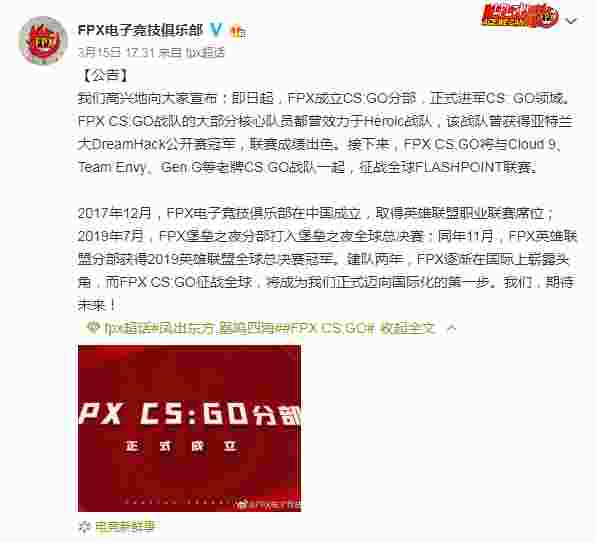 “我们高兴地向大家宣布:即日起,FPX成立CS:GO分部,正式进军CS: GO领域。