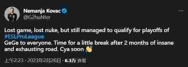 队友huNter-也发推感慨:输掉了比赛,输掉了Nuke,但还是成功晋级EPL淘汰赛阶段。在两个月的熬人的旅程之后终于可以休息下了。稍后见~