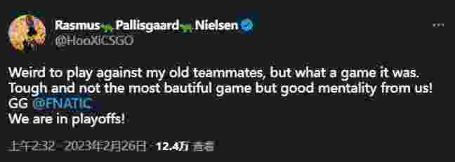赛后HooXi也在推特上表示:面对老队友的感觉很奇怪,但这场比赛非常精彩。虽然这场比赛并非最精彩的,但却非常艰难,而我们的心态也很好。
